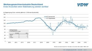 Frankfurt am Main, 16. März 2025 – Nach zwei Jahren mit spürbarer Investitionszurückhaltung zeigt die deutsche Werkzeugmaschinenindustrie erste Anzeichen einer Stabilisierung. Insgesamt blieb der Auftragseingang 2025 jedoch noch leicht unter dem Vorjahresniveau. Die Bestellungen gingen um 3 Prozent zurück – mit deutlich unterschiedlichen Entwicklungen im In- und Ausland. Während die Nachfrage aus dem Ausland um 3 Prozent zulegte, brach der Auftragseingang aus dem Inland um 16 Prozent ein. Die Investitionszurückhaltung vieler deutscher Industriekunden spiegelt damit die schwierige Lage wichtiger Anwenderbranchen wider, allen voran der Automobilindustrie und ihrer Zulieferer. Zum Jahresende deutete sich allerdings eine leichte Belebung an: Im vierten Quartal 2025 lagen die Auftragseingänge insgesamt um 4 Prozent über dem Vorjahreswert.